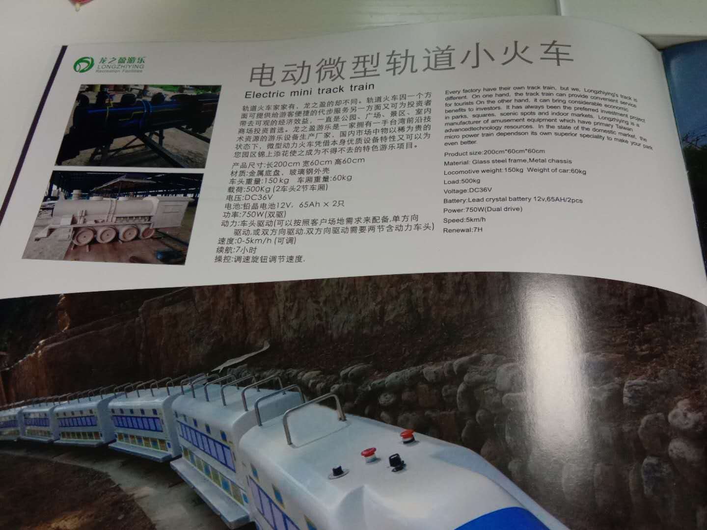下圖是我們龍之盈游樂(lè)公司生產(chǎn)的電動(dòng)微型軌道小火車(chē)的圖冊(cè)介紹,我拍的不是很清晰,在給你們?cè)敿?xì)的介紹一下吧,軌道火車(chē)很多游樂(lè)場(chǎng)里面都有,但是龍之盈的卻不同。軌道小火車(chē)因一個(gè)方面可提供給游客便捷的代步服務(wù),另一方面又可為投資者帶去可觀的經(jīng)濟(jì)效益,一直是公園、廣場(chǎng)、景區(qū)、室外商場(chǎng)投資的*選。